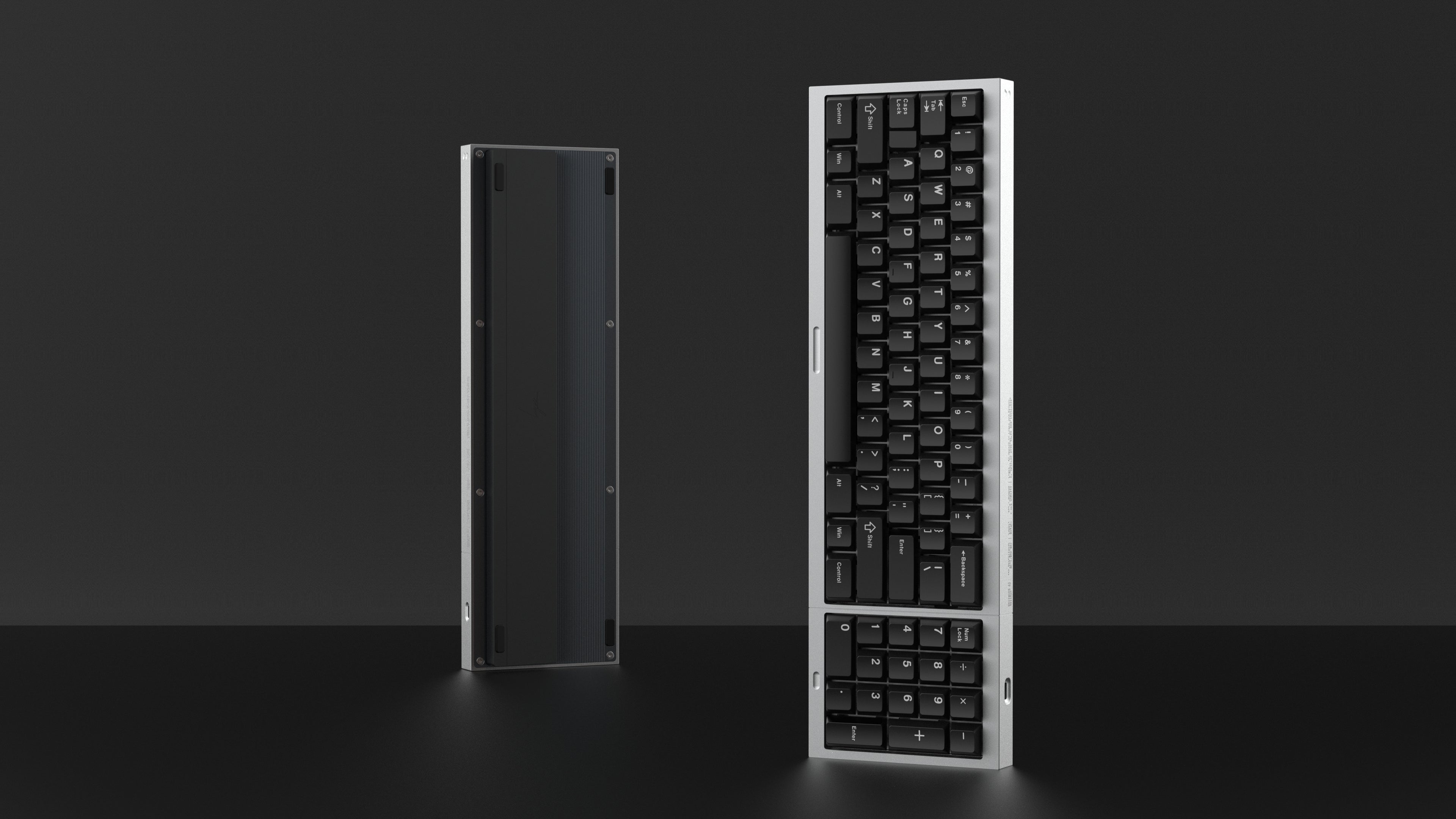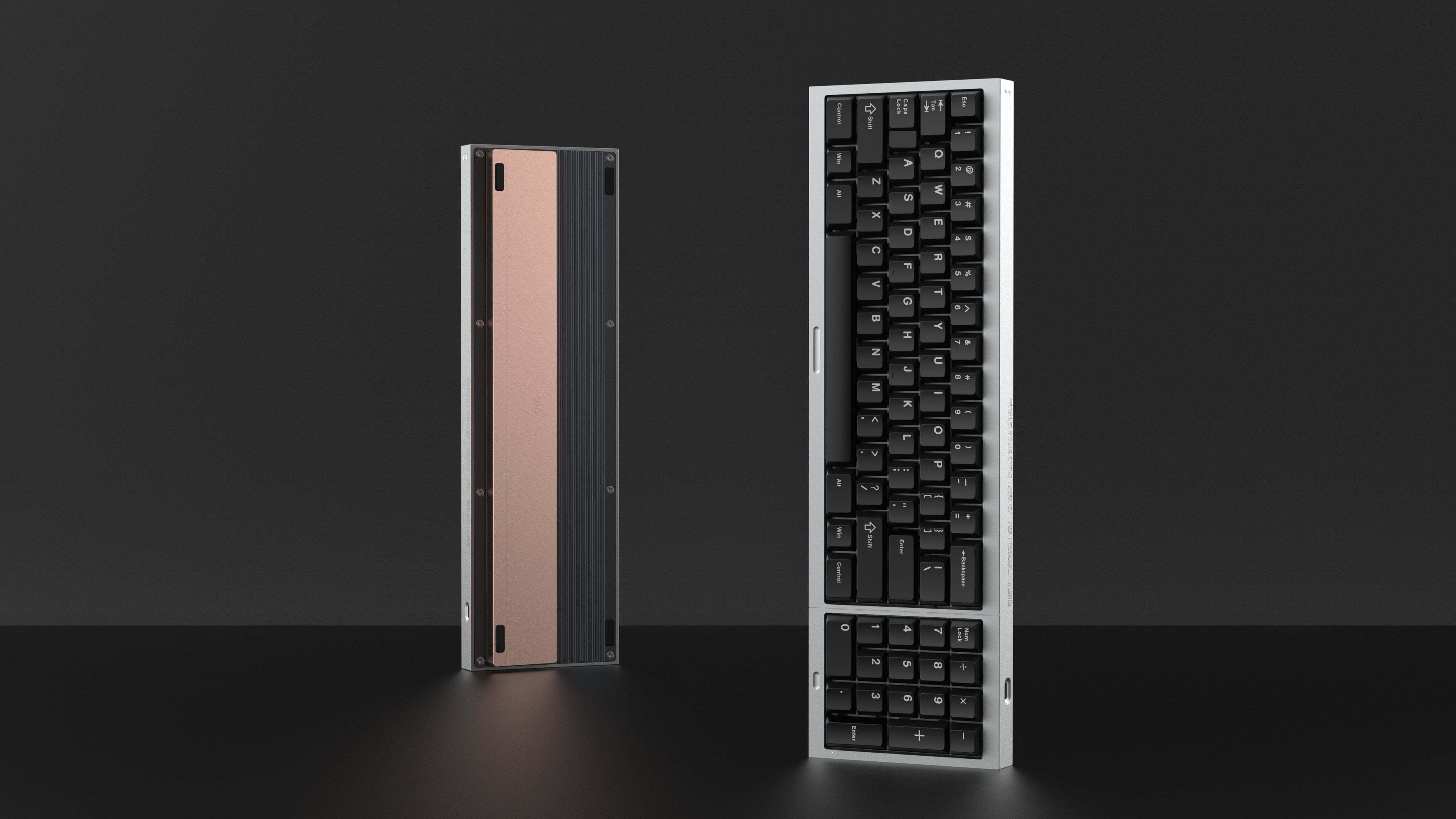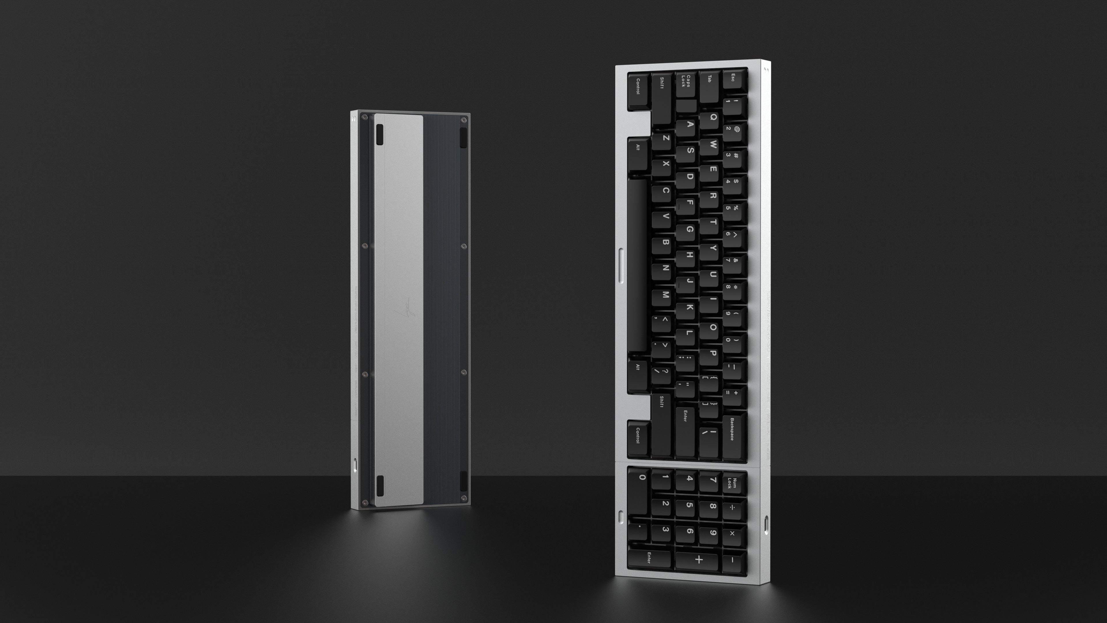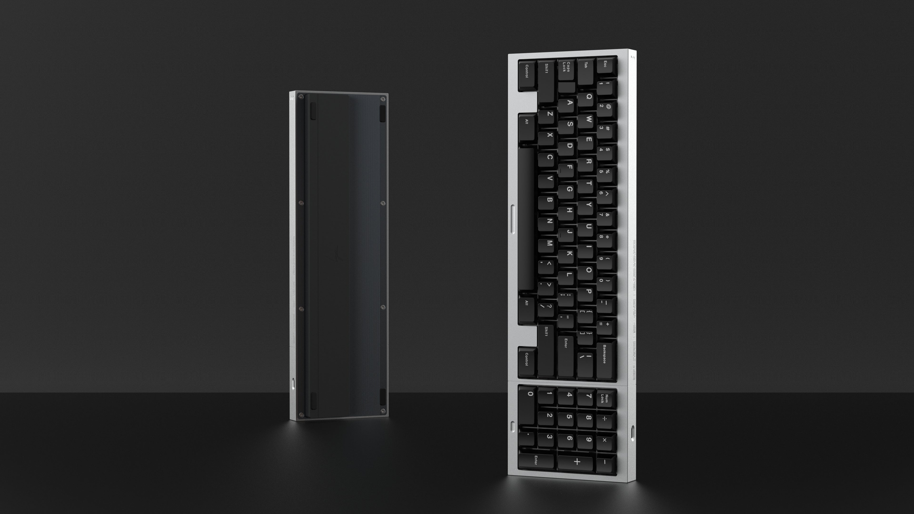 The board consists out of a top and bottom piece that house the split 60% and Numpad pcb/plate assembly. The top and bottom create two seprate chambers to lower the amount of unwanted resonance and both pcb's are connected through a ribbon cable that hides between the bottom case and weight.