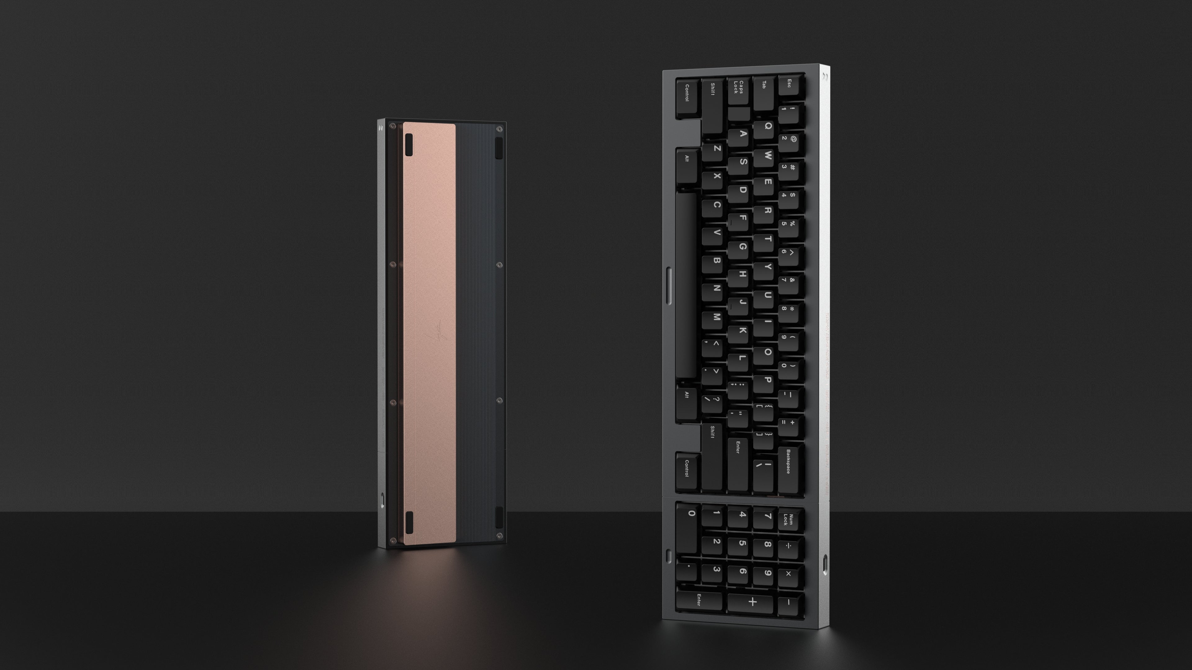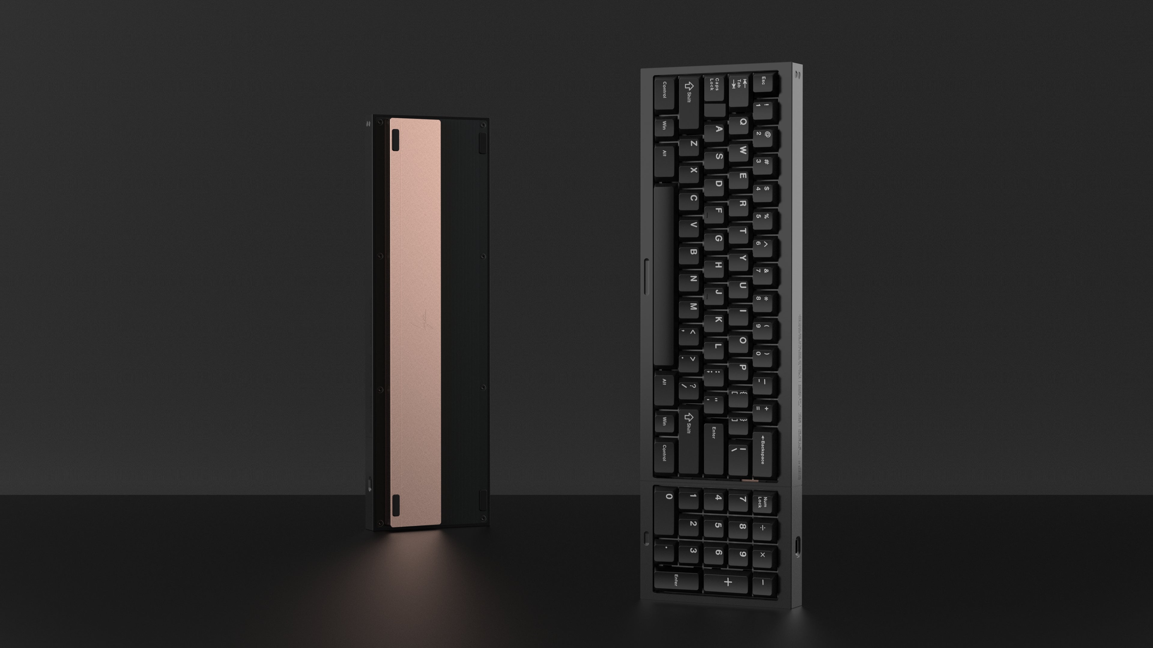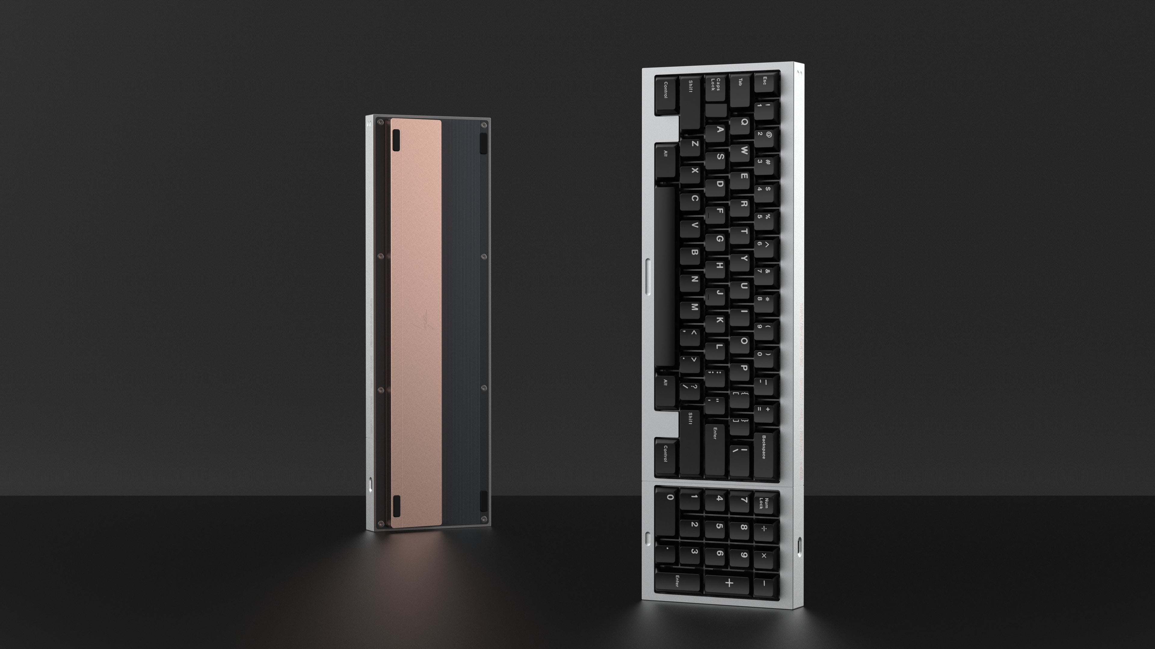 The board consists out of a top and bottom piece that house the split 60% and Numpad pcb/plate assembly. The top and bottom create two seprate chambers to lower the amount of unwanted resonance and both pcb's are connected through a ribbon cable that hides between the bottom case and weight.