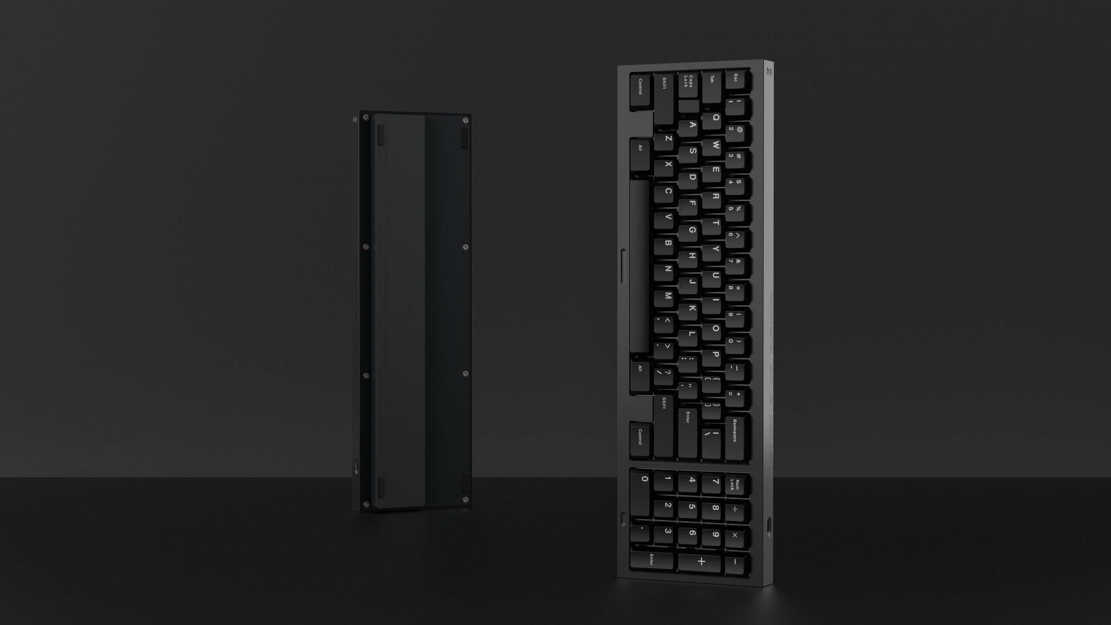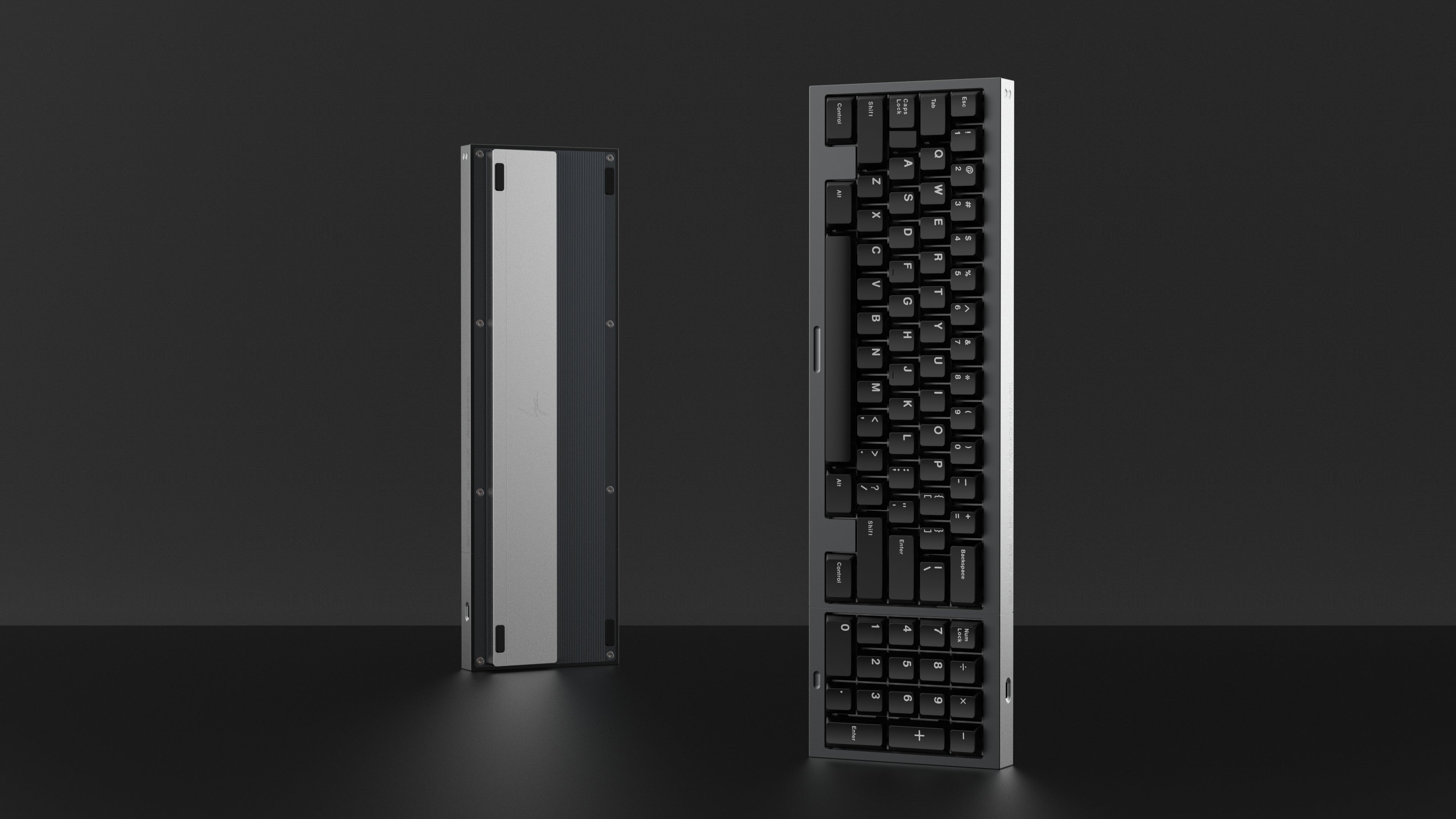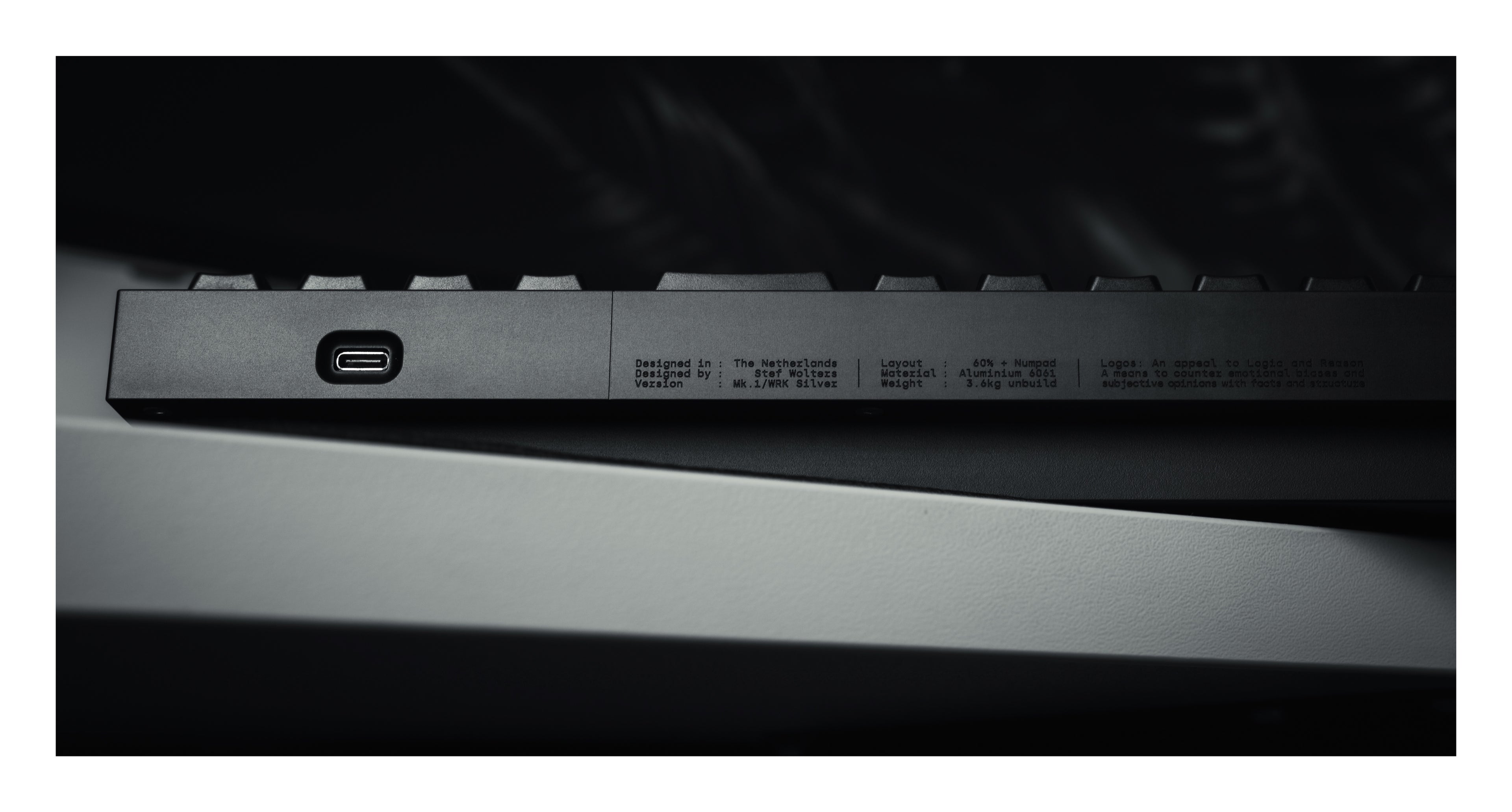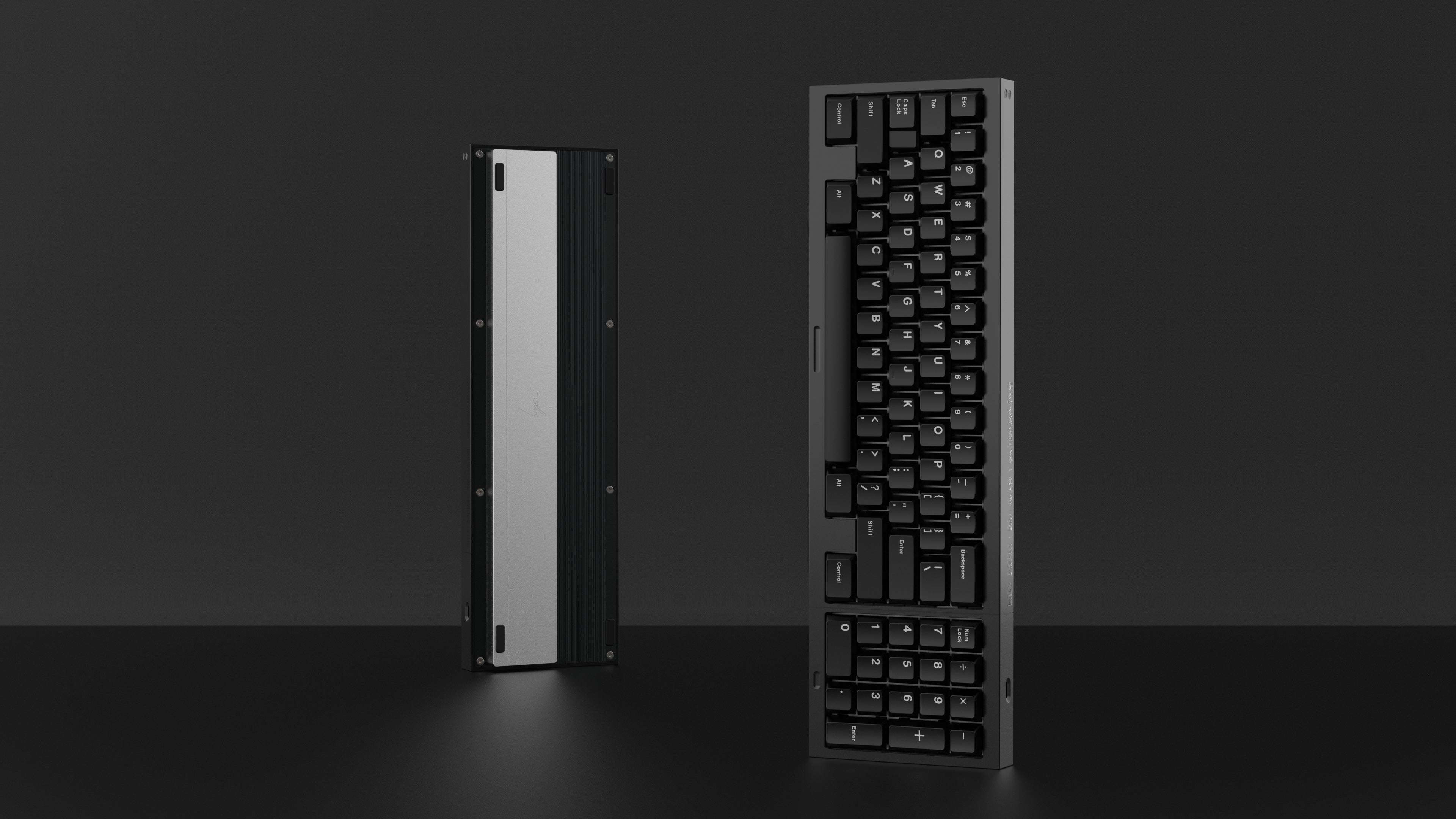 The board consists out of a top and bottom piece that house the split 60% and Numpad pcb/plate assembly. The top and bottom create two seprate chambers to lower the amount of unwanted resonance and both pcb's are connected through a ribbon cable that hides between the bottom case and weight.