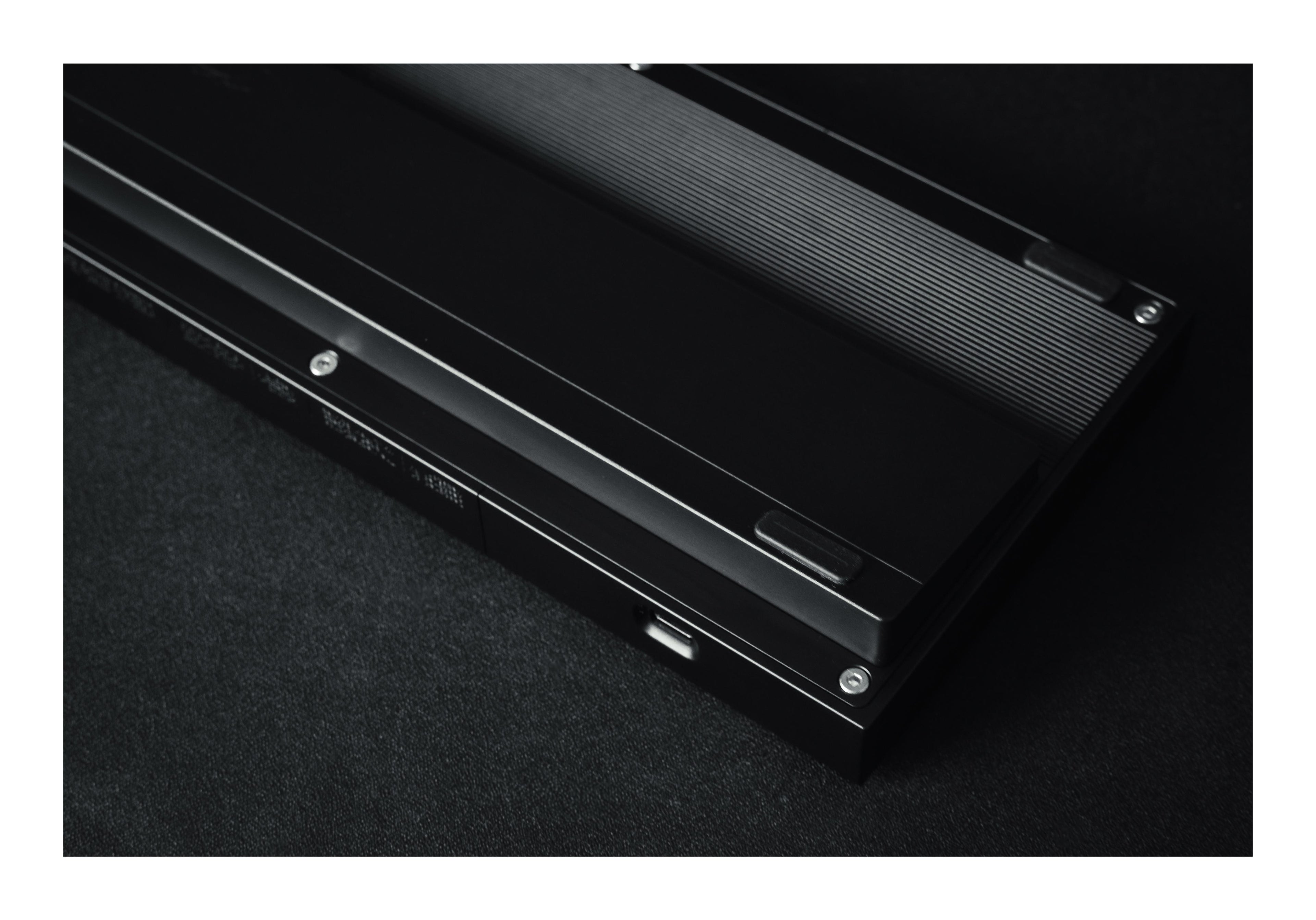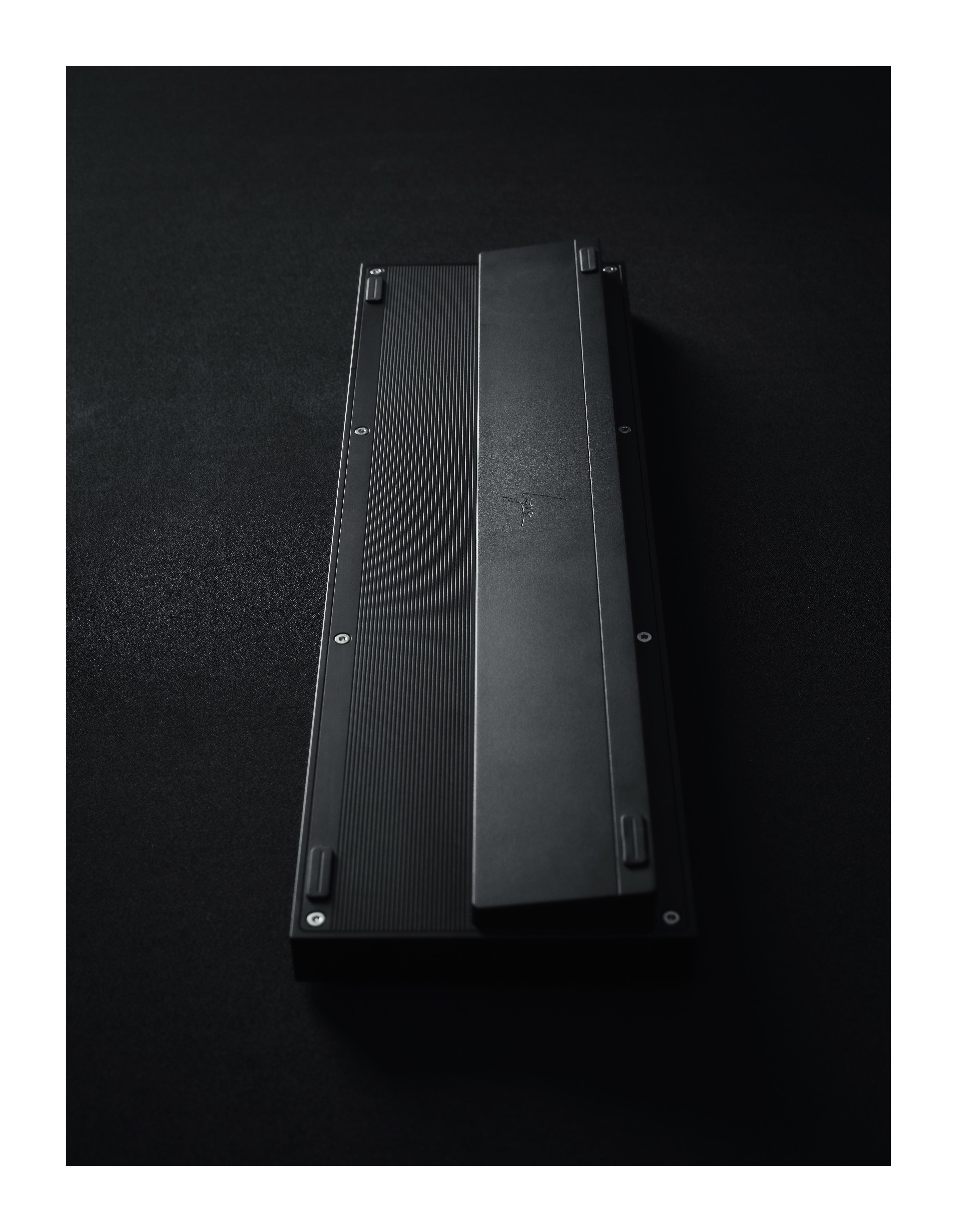 The large angled weight is mounted to the bottom to give the board it's heavy mass and give space for a small logo. Aside from this small logo and the visible screws on the bottom the back of the board contains engravings with the key specifications of the board to further lean into the industrial design language of the board.